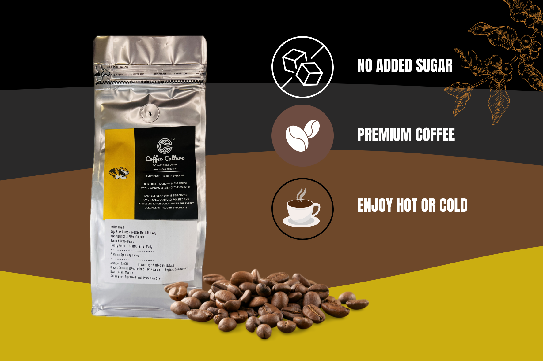 CC Coffee Culture Deja Brew Beans are made from 100% Indian Arabica coffee beans and roasted the Italian way. Blended to fuse the rich bittersweet and slightly acidic notes, CC Coffee Culture provides a smooth and mellow taste with rich flavor. It offers thick, red-brown cream, all-round satisfying and equally brilliant with the addition of milk or cream.