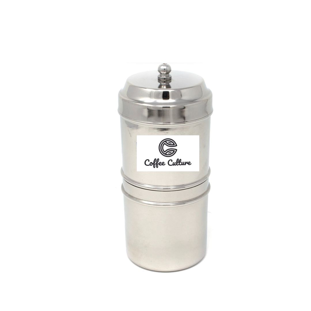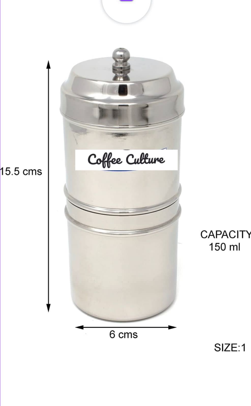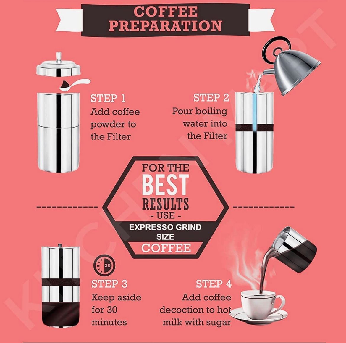 The stainless steel South Indian Filter Coffee Drip maker gives you a perfect south – Indian style coffee. You can enjoy now a delectable filter coffee right at your home with your loved ones. It is made with stainless steel so it’s durable and very easy to clean. It has a fine mesh for filtering the coffee decoction. This traditional Indian filter makes a coffee by mixing frothed and boiled milk with the infusion obtained by percolation brewing of finely ground coffee powder. In south India, this drink is known as Kappi. The drink is also referred to as Madras filter coffee, madras kappi, Kumbakonam degree coffee, Mylapore filter coffee or Mysore filter coffee. Outside India, the term filter coffee may refer to drip brew coffee, which is distinct from preparing coffee. Let us know How to make a perfect south Indian coffee with our coffee filter. In the upper chamber place the coffee filter then lightly tamp the powder using the pressing disc. Leave the disc in place after tamping. The powder should not be tamped as hard as espresso grounds. Now place the upper chamber on the lower one and fill the upper chamber with boiling water. Cover the coffee with filter and let it brew for 10 to 15 min. While the decoction is brewing, heat milk to a boil on the stove. When the decoction is finished, pour 1 to 2 Tbsps. Of the decoction into the dabarah with milk. now add sugar as per your desire. Pour the mixture back and forth between the dabarah and tumbler, using high arcing motions to pour, until the coffee is cool enough to drink. Serve in the dabarah, setting it in the tumbler.